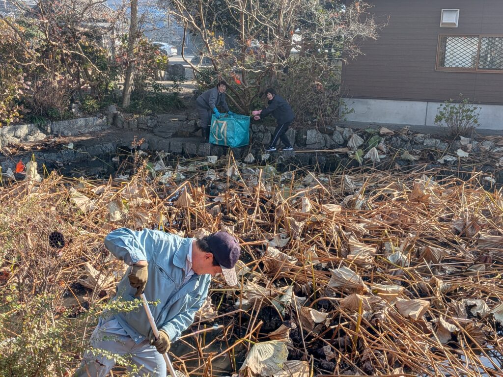 蓮池の掃除~7月・8月、朝田寺紅蓮(ちょうでんじこうれん)がピンクの花を咲かせます。 枯れ蓮を除き、肥料をあげて蓮根を育てます。