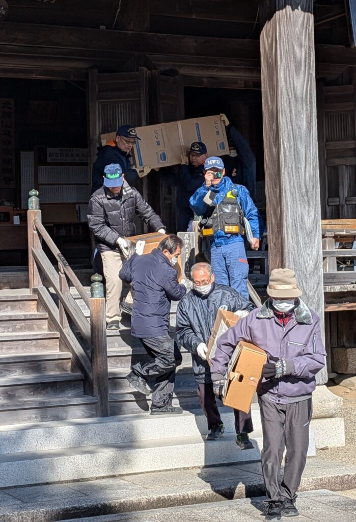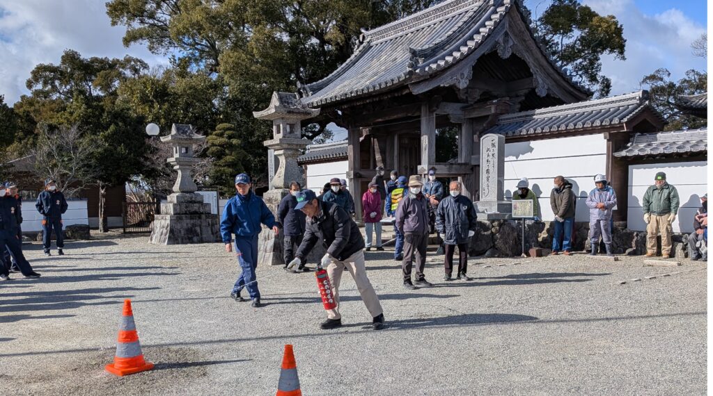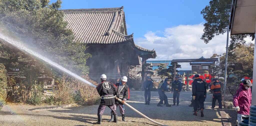 以上の文化財を守るため、毎年1月26日(文化財防火デー)に近い日曜日に防火訓練を行っています。今年は1月25日(日)午後1時30分から、通報訓練、文化財の持ち出し訓練、放水訓練、消化訓練を行いました。松阪市南消防署から4名、朝見地区消防分団13名、朝田町自警団・檀信徒26名が参加いただきました。