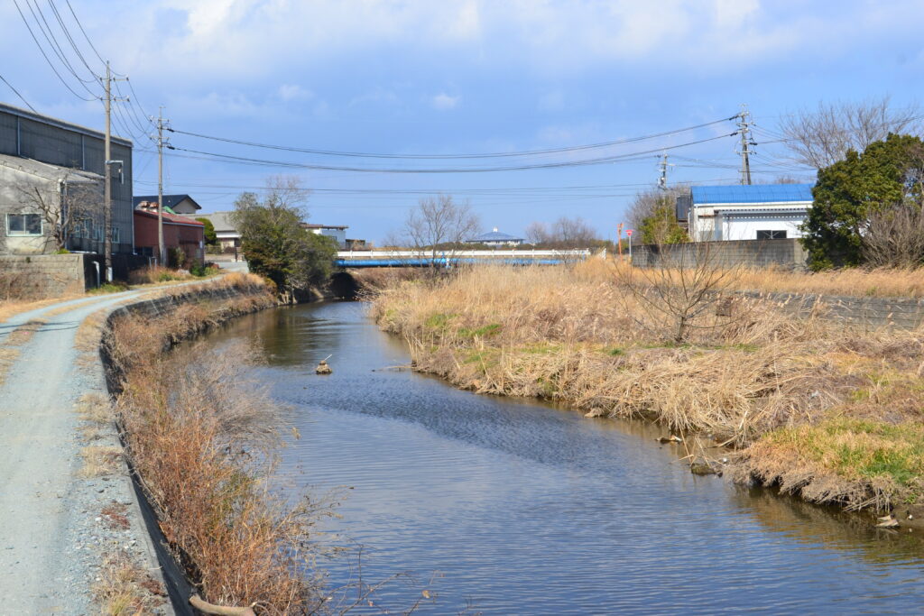 朝田町の西を流れる二本の川、堤防の高い方が金剛川。低い方が真盛川です。真盛川にはこんな話が残されています。